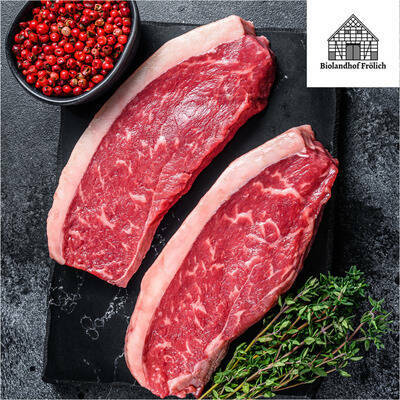 Dieses klassische Steak stammt aus dem hinteren Rücken des Rindes, dem sogenannten Roastbeef. Mit seiner charakteristischen Fettkappe und der feinen Marmorierung überzeugt es durch einen kräftigen, typischen Rindfleischgeschmack. Das magere, aber dennoch saftige Muskelfleisch ist feinfasrig und wunderbar zart. Ideal für die traditionelle Steak-Küche eignet es sich perfekt zum Kurzbraten und Grillen. Als vielseitiger Klassiker der gehobenen Küche begeistert es Fleischliebhaber durch seine ausgewogene Balance zwischen zartem Biss und aromatischem Geschmack.